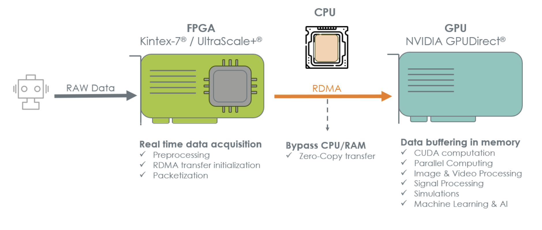 Selon Techway, un des principaux avantages de la technologie GPUDirect RDMA réside dans sa capacité à transférer les charges de travail de traitement du FPGA vers le GPU, le circuit programmable pouvant alors se concentrer sur les tâches d'acquisition de données en temps réel et sur des tâches “frontales” telles que la mise en paquets et le prétraitement des données avant de diffuser les données directement dans la mémoire du GPU.