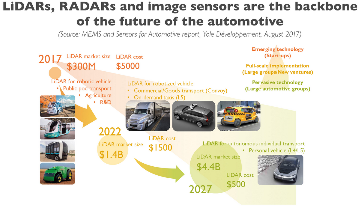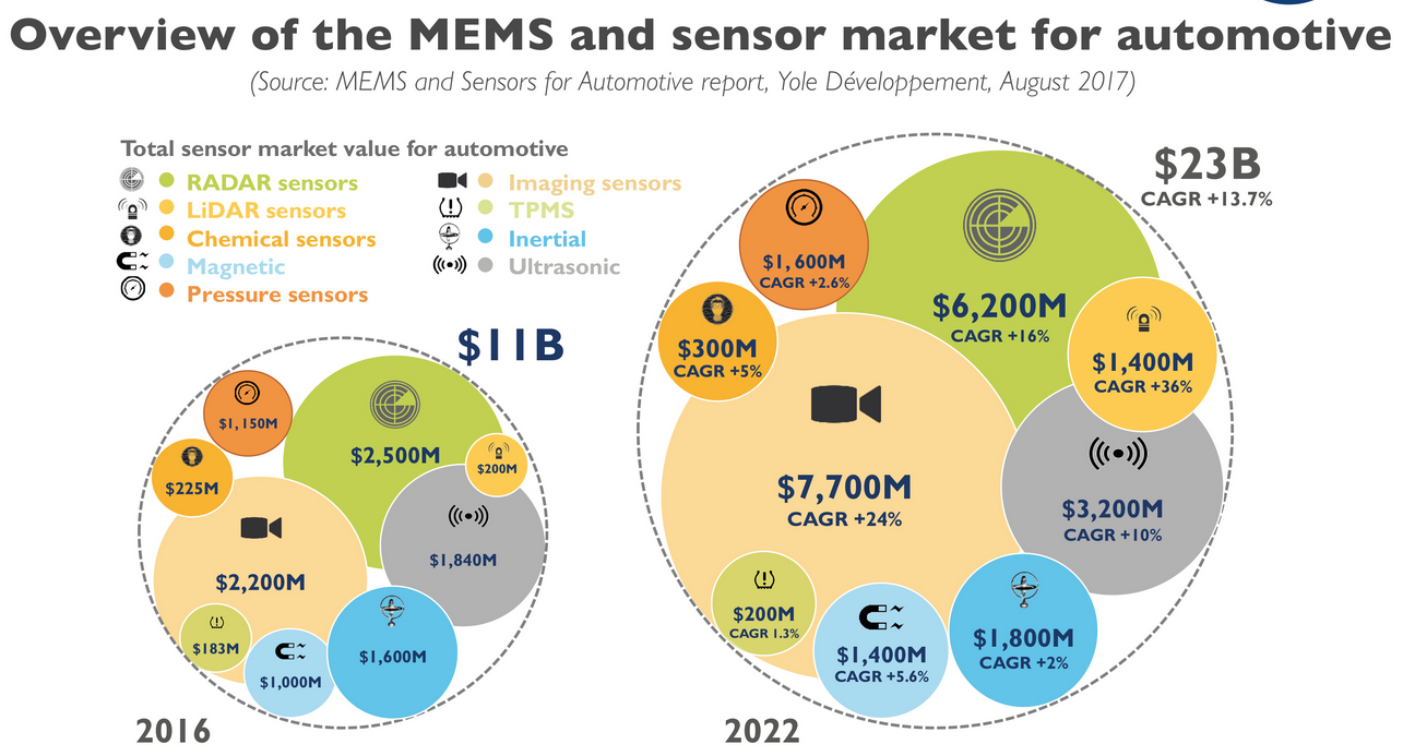 Selon une étude de la société française Yole Développement, le marché mondial des capteurs pour le domaine automobile pourrait atteindre 23 milliards de dollars en 2022, un chiffre multiplié par plus de deux en six ans (selon Yole, ce marché s’est établi en 2016 à 11 M$). ...A l’origine de cette forte progression, on trouve les travaux menés par la totalité des grands constructeurs et équipementiers automobiles dans le monde pour développer, mettre au point et intégrer des fonctions d’assistance évoluée à la conduite qui in fine conduiront à la voiture autonome.