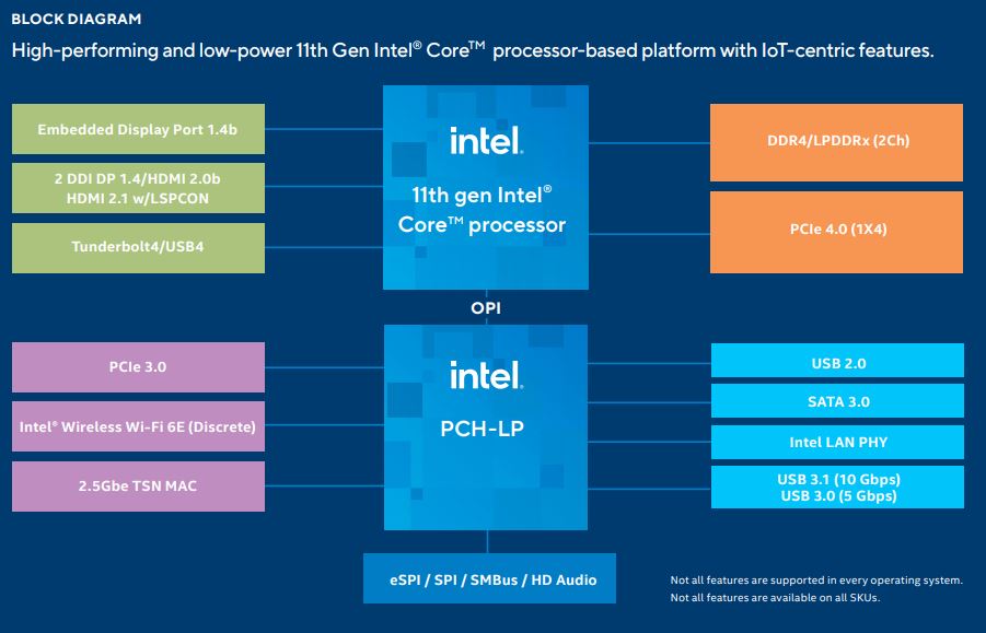 A cet effet on notera que les derniers-nés des processeurs Core de 11e génération, qui se déclinent en deux familles (Embedded et Industrial) et dont les enveloppes thermiques sont comprises ente 12 W et 28 W, prennent aussi en charge les technologies Intel Time Coordinated Computing (Intel TCC) et Time Sensitive Networking (TSN). Celles-ci sont censées améliorer les temps d’exécution au pire cas, garantir des performances déterministes à faible latence et réduire la gigue dans les applications de contrôle de processus synchones. A ce titre, selon les modèles, les processeurs intègrent, via le circuit compagnon PCH-LP, un contrôleur MAC Ethernet à 2,5 Gbit/s compatible TSN (ainsi qu’entre autres, un contrôleur MAC Ethernet à 1 Gbit/s, quatre ports PCIe 4.0, douze PCIe 3.0 et quatre ports USB 4/Thunderbolt 4). Selon Intel, plus de 90 sociétés se sont déjà engagées à proposer des solutions bâties sur les familles Core i3/i5/i7 de 11e génération adaptées à l’IoT. Parmi celles-ci figurent un certain nombre de fabricants de cartes mères et de modules processeurs qui, dans la foulée de l’annonce du fabricant de semi-conducteurs, ont dévoilé officiellement de premiers produits. En voici une liste préliminaire :