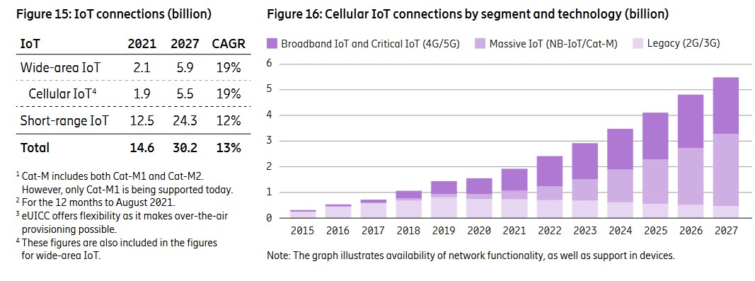 Les technologies Massive IoT devraient représenter plus de la moitié des connexions IoT cellulaires en 2027[EDITION ABONNES] Selon la dernière édition du rapport sur la mobilité (Mobility Report) publié par Ericsson, le nombre d’abonnements à la 5G devrait atteindre 4,4 milliards d’ici à la fin 2027, soit environ la moitié de tous les abonnements mobiles à cette date. ...Fin 2021, on devrait compter près de 660 millions d’abonnements 5G, ce qui ferait de cette technologie la génération mobile au déploiement le plus rapide. Pour ce qui concerne l’Internet des objets (IoT), le secteur qui intéresse plus particulièrement le milieu de l’embarqué, l’IoT large bande (Broadband IoT, bâti sur les technologies 4G et 5G) a désormais surpassé la 2G/3G en tant que segment connectant le plus grand nombre d’applications IoT. Selon l’équipementier scandinave, le Broadband IoT devrait représenter 47% de toutes les connexions cellulaires IoT d’ici à la fin 2021, contre 37% pour la 2G/3G et 16% pour les technologies Massive IoT (NB-IoT et Cat-M) (voir illustration ci-dessous). Les nouvelles prévisions pointées par Ericsson réaffirment l’accélération rapide des déploiements Massive IoT dans les années qui viennent pour des cas d’usage comme les dispositifs électroniques de santé connectée portés sur soi, le suivi d’actifs dans le domaine de la logistique, la surveillance environnementale, les compteurs intelligents et les équipements de suivi et de contrôle en milieux industriels. A ce titre, les déploiements Massive IoT devraient représenter 51% de toutes les connexions IoT cellulaires d’ici à 2027. Pendant la même période, le nombre de connexions pour accès sans fil fixe (FWA, Fixed Wireless Access) devrait tripler pour atteindre environ 230 millions d’unités en 2027 contre 88 millions à la fin 2021. Pratiquement la moitié de ces connexions devraient être assurées par les réseaux d’infrastructure 5G. Vous pouvez aussi suivre nos actualités sur la vitrine LinkedIN de L'Embarqué consacrée aux réseaux LPWAN et 5G pour l’Internet des objets : LPWAN & 5G