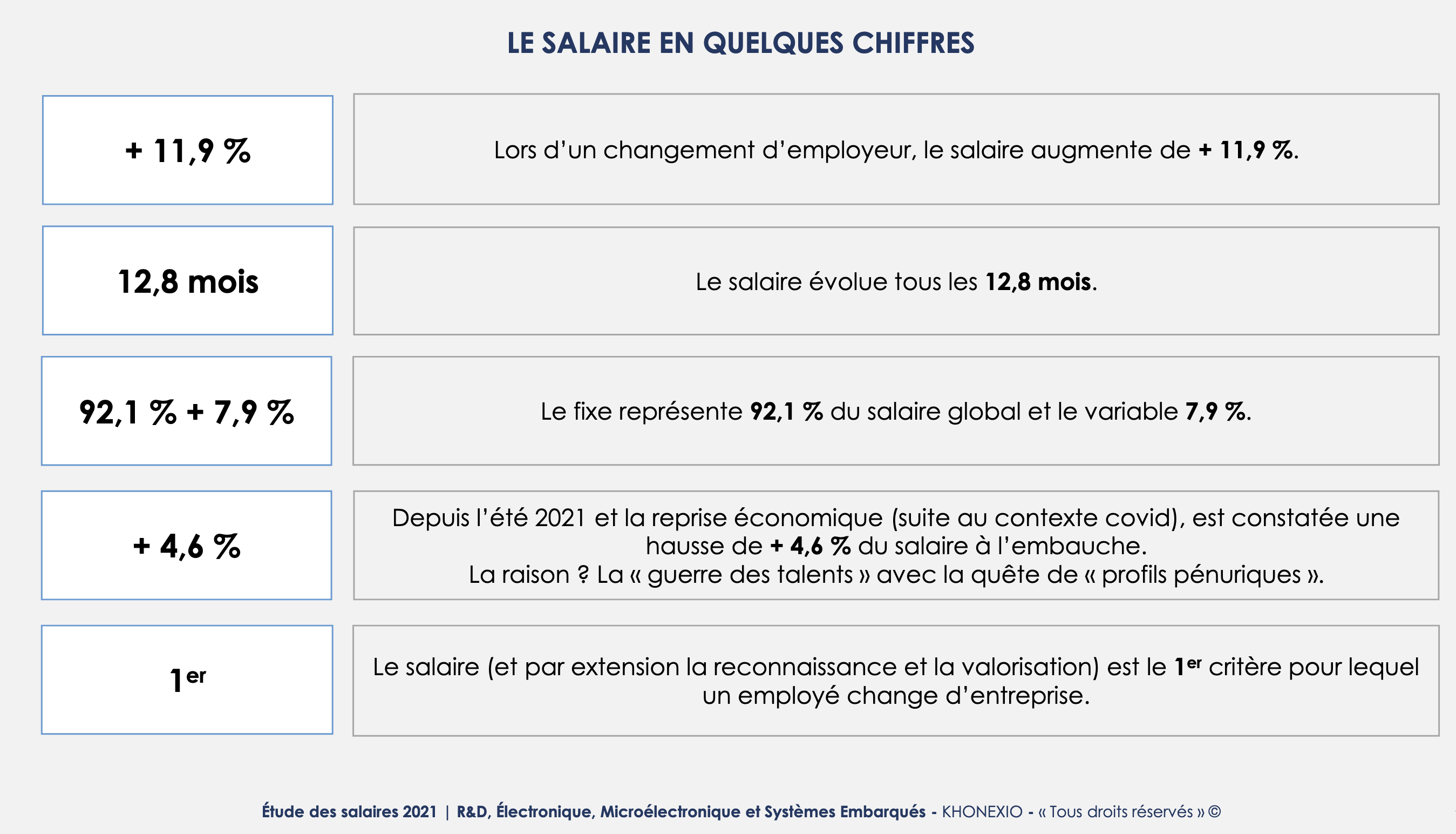 Le salaire à l'embauche a augmenté de 4,6% depuis l'été 2021 dans l’électronique et l'embarquéRecruteur spécialisé dans l’électronique et les systèmes embarqués au sein du cabinet Khonexio, David Hourdebaigt publie la seconde édition de l’enquête sur les salaires dans le domaine de l’électronique et des systèmes embarqués. Celle-ci repose sur un panel de 19 461 diplômés d’études supérieures interrogés entre le 4 octobre et le 10 décembre 2021. Avec des profils s'étageant entre l’ingénieur et le directeur, avec des formations de niveau bac+5 et au-delà. Même si la sélection est orientée en fonction des demandes des entreprises clientes du cabinet, la plupart des disciplines de l’électronique et des systèmes embarqués ont été ici analysées, avec cependant une double réserve. Les techniciens (niveaux bac +2 ou +3) dans ces domaines ne sont pas représentés, tout comme la population des ingénieurs ayant plus de 25 années d’expérience. Cette synthèse se veut néanmoins un reflet le plus objectif possible d’une moyenne du marché. Dans le document publié par David Hourdebaigt, la donnée “salaire” est exprimée en euros bruts annuels et prend en compte la part fixe et la part variable (participation, intéressement…) de la rémunération. L’enquête a été conduite dans une logique de type carrière (ingénieur - chef de projet - manager/directeur) et l’évolution des salaires a ensuite été calculée sur des durées moyennes de parcours professionnels (5,5 ans pour les ingénieurs, 7,9 ans pour les chefs de projet, etc.). Et ce pour une série de 13 expertises métier en électronique (conception analogique, numérique, puissance, FPGA…) et 13 en systèmes embarqués (C embarqué, Linux C++/Qt, traitement du signal, test et validation, sûreté de fonctionnement…). Les résultats présentés sur 17 pages permettent aussi de se faire une idée sur les différences de salaires entre la région parisienne et le reste de la France, estimées à environ 14% pour un profil d’ingénieur identique, ainsi que sur les différences constatées entre les domaines applicatifs (automobile, aéronautique, médical, ferroviaire…). Le secteur de la Défense est celui qui est le plus rémunérateur sur le marché, constate notamment l’enquête. Le document écrit par David Hourdebaigt est accessible ici.