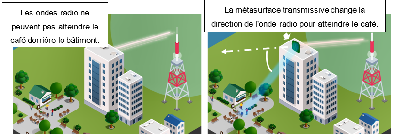 En installant une métasurface transmissive en dehors de la fenêtre sur le lieu A, la force du signal a été mesurée à -68 dBm, équivalente à celle du lieu B lorsque la ligne de mire est dégagée. A l’heure actuelle, la firme nippone développe une métasurface transmissive transparente, plus respectueuse du paysage, et intègre des avancées technologiques pour concentrer les ondes radio vers des lieux précis et améliorer davantage la force du signal. En outre, l'entreprise est en train de développer une surface intelligente reconfigurable (RIS) qui peut créer un environnement de signal intelligent afin de modifier avec flexibilité la direction du signal selon l'appareil utilisé. (Les ondes radio pourront y être redirigées en modifiant électriquement la phase des élements sur la métasurface.) |