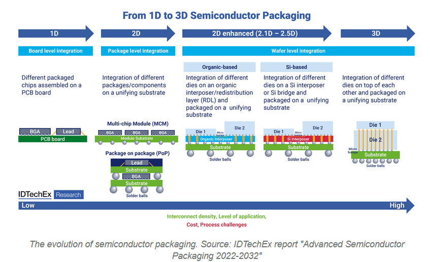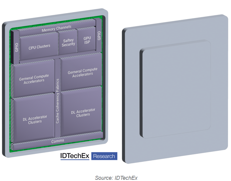 En tant que tels, les développeurs HPC automobiles doivent réfléchir à la manière dont ils peuvent optimiser les technologies existantes pour obtenir le maximum de performances. L'une des approches envisagées par IDTechEx consiste à se concentrer davantage sur l'intelligence artificielle (IA), les réseaux de neurones (NN) et les accélérateurs d'apprentissage profond (Deep Learning). L’idée est de mettre en œuvre de nouvelles stratégies de traitement des données améliorées par l’IA, réduisant ainsi le recours aux approches classiques que l’on trouve dans les GPU. Cela peut améliorer les performances de la puce à moindre coût, en nécessitant moins d'investissement dans des technologies de nœuds plus petits et en produisant même un avantage global en matière d'efficacité. IDTechEx constate que l'IA devient plus courante dans les diagrammes de blocs des puces-systèmes des principaux fournisseurs de niveau 2 comme Mobileye et Renesas. Mais une perspective particulièrement intéressante est celle de Recogni. Recogni est une start-up qui a développé un accélérateur IA pour les applications SoC de conduite autonome qui promet une puissance de calcul et une efficacité révolutionnaires. Même avec la réduction de la taille des nœuds et des solutions IA imaginatives, l’industrie des puces de calcul dans son ensemble continue de constater un ralentissement du rythme de développement. La loi de Moore stipule que la puissance de calcul devrait doubler tous les deux ans, une formule empirique vieille de plusieurs décennies et qui est restée valable jusqu'à récemment. Or certains disent que la loi de Moore commence à ralentir à mesure que l'industrie est confrontée à des défis technologiques de plus en plus difficiles pour réaliser des gains progressifs de plus en plus faibles. D’autres assurent que la loi de Moore est morte. Une technologie émergente : les "chiplets" Une solution importante pour faire face au ralentissement de la loi de Moore et à l'augmentation substantielle du coût de fabrication des circuits intégrés monolithiques est le concept de "chiplets". Le concept de base des chiplets consiste à déconstruire un circuit intégré monolithique en blocs fonctionnels distincts, à transformer ces blocs en chiplets séparés, puis à les réassembler au niveau du packaging. L'objectif ultime d'un processeur bâti sur des chipsets est de maintenir ou d'améliorer les performances tout en réduisant les dépenses globales de production par rapport aux circuits intégrés monolithiques traditionnels. L'efficacité de la conception des chipsets repose largement sur les techniques de packaging, en particulier celles utilisées pour interconnecter plusieurs chiplets, car elles ont un impact significatif sur les performances système globales. Ces technologies avancées de conditionnement de semi-conducteurs, englobant des approches telles que les circuits intégrés 2,5D, les circuits intégrés 3D et le procédé d'encapsulation de puce au niveau tranche de sortance (Fan-Out Wafer-Level), sont collectivement appelées "conditionnement avancé de semi-conducteurs".. Ces techniques de pointe facilitent la convergence de plusieurs chiplets, souvent produits à différents nœuds de processus, sur un seul substrat. Cette convergence est rendue possible par l'utilisation de tailles de bossage compactes, permettant ainsi des densités d'interconnexion accrues et des capacités d'intégration supérieures. S'inspirer du secteur informatique Pour examiner le paysage actuel des technologies avancées de conditionnement de semi-conducteurs dans l’industrie, prenons le secteur des processeurs pour serveurs comme exemple illustratif. Alors que la plupart des processeurs pour serveurs contemporains sont construits autour de conceptions monolithiques de puces-systèmes, des développements notables ont émergé. En 2021, Intel a annoncé son prochain processeur pour serveur, Sapphire Rapids, qui adoptera une nouvelle approche. Ce processeur de nouvelle génération sera construit sous la forme d'un module à quatre puces interconnectées via la technologie EMIB (Embedded Multi-Die Interconnect Bridge) d'Intel, représentant une solution avancée de conditionnement de semi-conducteurs 2,5D. Parallèlement, AMD a exploité la puissance des techniques avancées de conditionnement de semi-conducteurs 3D pour améliorer les performances des processeurs pour serveurs. Dans le cas de sa dernière puce en date, référencée Milan-X et sortie en mars 2022, AMD utilise une stratégie de packaging 3D qui consiste à empiler une puce de cache directement au-dessus du processeur. Cette innovation se traduit par une augmentation de la densité d'interconnexion de plus de 200 fois par rapport au packaging 2D conventionnel, selon les affirmations d'AMD. Ces développements ne se limitent pas aux seuls processeurs ; le domaine des centres de données a également été témoin de l'intégration de technologies avancées d’encapsulation de semi-conducteurs pour d'autres composants, tels que les accélérateurs. Nvidia, un acteur clé, utilise depuis 2016 la technologie de packaging 2,5D de TSMC connue sous le nom de Chip on Wafer on Substrate (CoWoS) pour ses accélérateurs GPU haut de gamme. Cette vague d'adoption, illustrée par Intel et AMD dans leurs produits de pointe, indique une utilisation croissante des technologies avancées de packaging de semi-conducteurs dans l'ensemble du secteur. La tendance va au-delà des processeurs pour serveurs et englobe une variété de composants pour centres de données. À mesure que le paysage industriel évolue, ces méthodologies innovantes sont sur le point de jouer un rôle central dans l'amélioration des performances, de l'intégration et de l'efficacité.