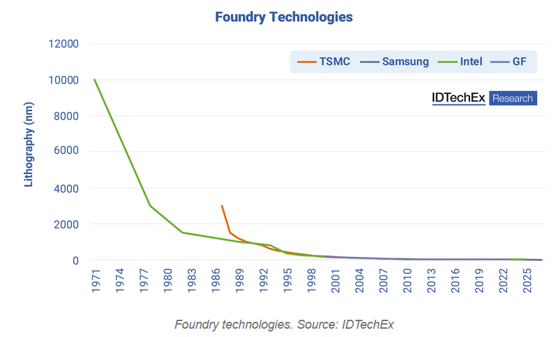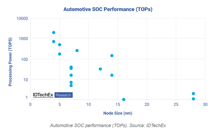 Ces dernières années, IDTechEx a vu Mobileye, Nvidia et d'autres passer entre 2018 et 2021 de solutions FinFET de 28 nm à 7 nm et moins. Cependant, les fonderies sont désormais capables de produire désormais des puces à des technologies inférieures à 5 nm et se dirigent vers des technologies inférieures à 1 nm. IDTechEx a constaté que chaque fois que la technologie de gravure est réduite de moitié, la puissance de calcul augmente d'un facteur 10. Mais passer à des nœuds technologiques de plus en plus petits deviendra de plus en plus coûteux. Une seule tranche de 300 mm de technologie TSMC 3 nm coûte environ 20 000 dollars et ce prix continuera d'augmenter au fur et à mesure que des technologies inférieures à 3 nm seront exigées dans une variété d'industries, depuis les applications informatiques classiques telles que les téléphones, les ordinateurs portables et les PC, jusqu'aux nouvelles demandes provenant du secteur automobile.