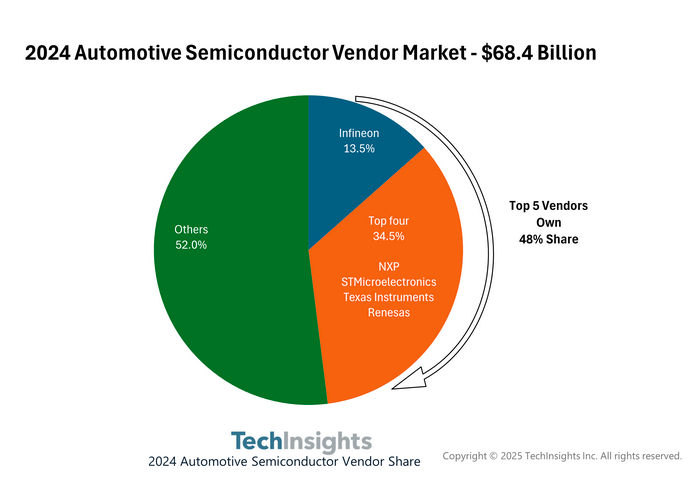 Le marché des semiconducteurs pour l'automobile s'est établi en 2024 à 68,4 Md$, en baisse de 1,2 % par rapport à 2023[EDITION ABONNES] Les résultats de l’étude annuelle menée par la société d’analyse de marché TechInsight, montrent que le chiffre d'affaires des fournisseurs de semiconducteurs pour le domaine automobiles a diminué de 1,2 % en 2024 par rapport à l'année précédente, passant de 69,2 milliards de dollars en 2023 à 68,4 milliards de dollars. Selon TechInsight, le secteur a connu une baisse significatie de ses stocks en 2024, les utilisateurs de premier rang et les équipementiers ayant épuisé le leur. Ce stock était resté en rayon en raison de la demande qui s'était accrue pendant la pénurie de composants semi-conducteurs de 2020 à 2022, mais le ralentissement actuel de la demande de véhicules électriques qui a débuté au dernier semestre 2023 s'est intensifié en 2024, entraînant un décalage entre les revenus de l'offre et la hausse de 9,5 % de la consommation de semi-conducteurs liée à la production automobile en 2024. Côté fournisseurs, Infineon et NXP ont conservé leur position en tête du classement des fournisseurs de semiconducteurs automobiles en 2024, Infineon ayant conservé son avance sur NXP mais avec un écart qui s'est réduit de quatre à trois points de pourcentage en 2024. En résumé, les parts de marché des cinq principaux fournisseurs pour l'année civile 2024 sont Infineon (13,4 %), NXP (10,4 %), STMicroelectronics (8,8 %), Texas Instruments (8,4 %) et Renesas (6,8 %). Les entreprises constituant la moitié inférieure du top 10 étaient onsemi, Micron, Qualcomm, Bosch et Analog Devices. D’un point de vue général, l’année 2024 a été difficile pour les principaux fournisseurs de semiconducteurs automobiles, notamment Infineon, NXP, STMicroelectronics, Texas Instruments et Renesas, note TechInsight. La dynamique autour des véhicules électriques s'étant enlisée, les consommateurs de semiconducteurs (constructeurs et équipementiers) ont compensé leurs achats en s'appuyant sur les stocks accumulés entre 2020 et 2022. Malheureusement, indique TechInsight, l’année 2025 ne débute pas sous de bons auspices, les entreprises devant surmonter pour assurer leur croissance, les perturbations potentielles du marché liées en particulier à l’instabilité des droits de douane mondiaux.