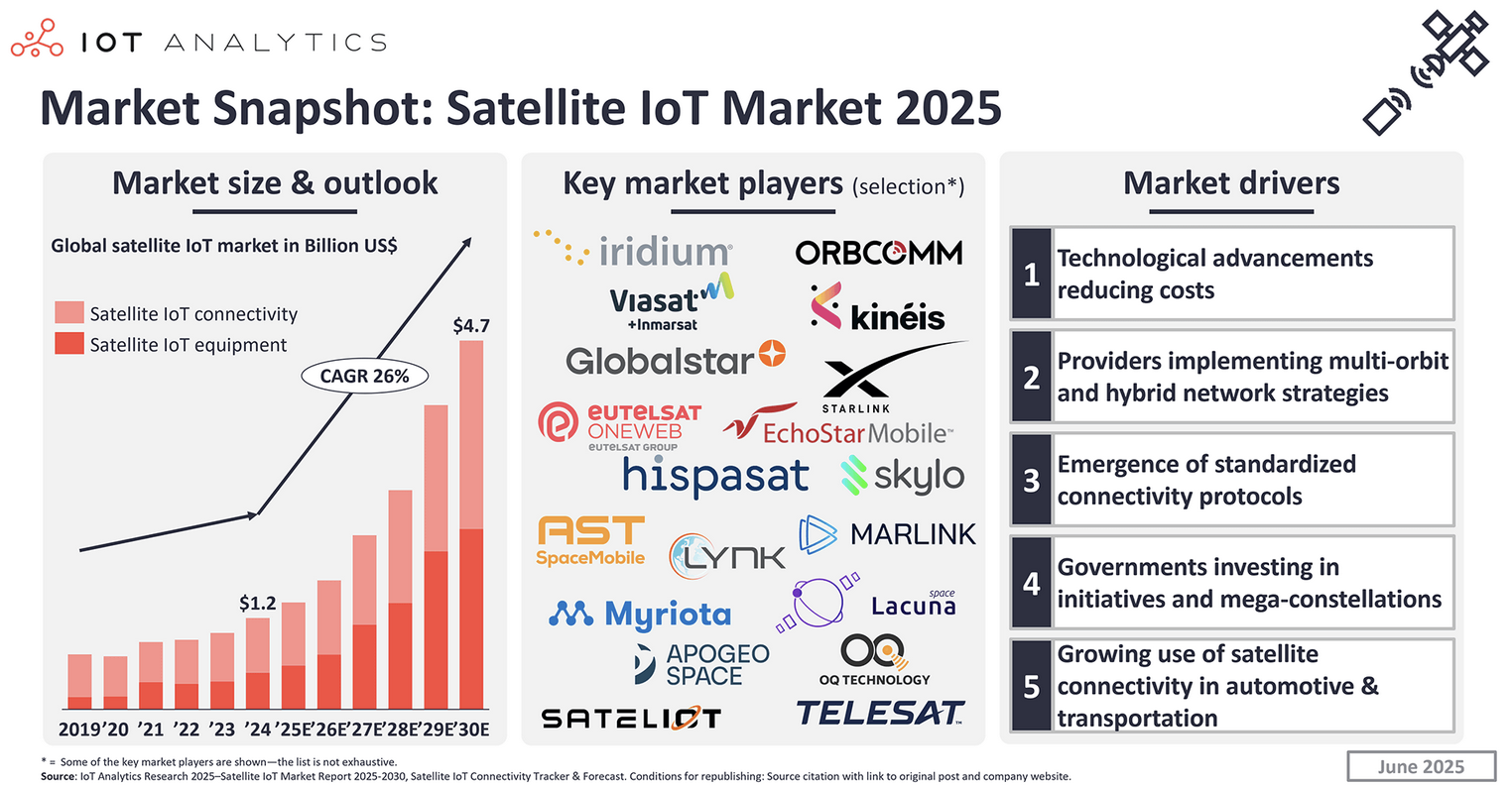 Le marché de l'IoT par satellite devrait croître de 26 % par an pour atteindre 4,7 milliards de dollars d'ici 2030[EDITION ABONNES] Selon une récente étude de la société d’analyse de marché IoT Analytics, publiée dans un rapport intitulé "Satellite IoT Market Report 2025–2030", le marché mondial de la connectivité et des équipements IoT par satellite se développe très rapidement, avec un taux de croissance moyen annuel estimé à 26 %, pour atteindre 4,7 milliards de dollars d'ici 2030. Sur la base de cette étude, IoT Analytics a dégagé cinq facteurs clés qui sont à l’origine de cette forte progression. Tout d’abord, les progrès technologiques réduisent les coûts. L'industrie des satellites passe des satellites géostationnaires lourds (à la miniaturisation rentable de satellites en orbite basse l'orbite terrestre basse (LEO). De plus, la conception standardisée et modulaires des satellites réduisent leurs coûts, y compris au niveau des frais de lancements. Second facteur, les coûts de connectivité par satellite diminuent grâce à des satellites plus petits et évolutifs avec côté fournisseur des stratégies de réseau multi-orbites et hybrides. Celles-ci permetteht d’optimiser la connectivité par satellite pour les applications IoT grâce notamment à des collaborations qui se mettent en place entre opérateurs de réseaux mobiles et opérateurs de réseau satellitaires ce qui favorise une connectivité hybride satellite-terrestre. Troisième facteur, au fur et à mesure que de nouvelles normes apparaissent, la part de marché prise par les satellites traditionnels devrait diminuer considérablement d'ici 2030, avec l'arrivées des satellites en orbite basse dotés de modules IoT intégrés délivrant de multiples options de connectivité pour plus de flexibilité. Quatrième facteur, IoT Analytics constate que les gouvernements investissent de plus en plus fréquemment dans des initiatives de mise en oeuvre de méga-constellations. A l’heure actuelle ces entités étatiques sont les principaux moteurs de la demande en infrastructures satellitaires. Enfin, le rapport d’IoT Analytics indique qu’une utilisation croissante de la connectivité par satellite apparait notamment dans les secteurs de l'automobile et des transports. Ces domaines d’utilisation de l’IoT satellitaire devraient même à terme dominer l'utilisation de la connectivité au standard 3GPP NTN (Non Terrestrial Network).