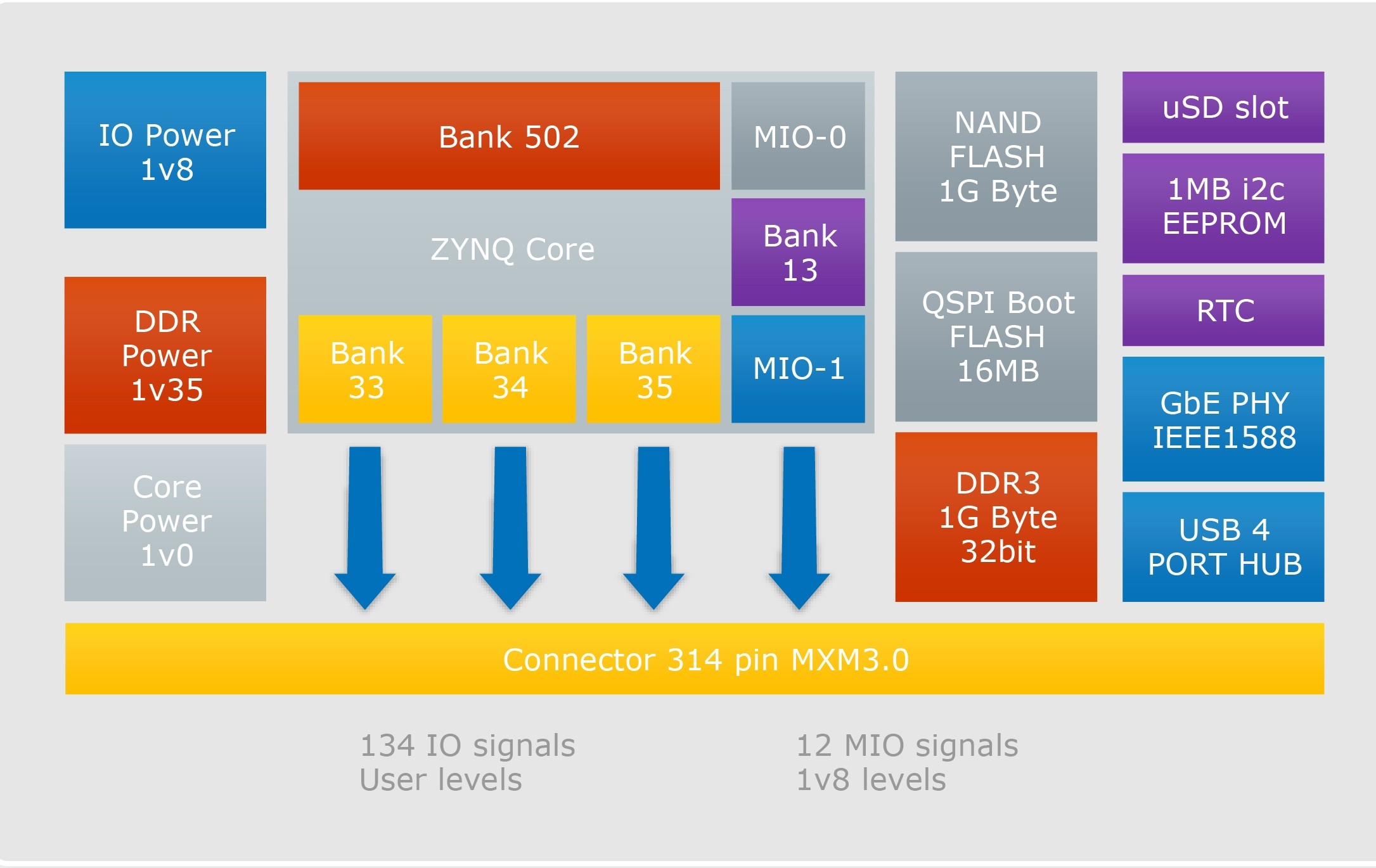 EnSilica lance une carte SOM basée sur la plate-forme Zynq de XilinxSous la référence eSi-ZM1, la société britannique de design et fournisseur de blocs d’IP EnSilica lance une carte de petit format (50 x 82 mm) de type SOM (System On Module), basée sur l’architecture Zynq de Xilinx, ... architecture qui associe une matrice de FPGA Series 7 de la société avec un cœur ARM Cortex-A9. C'est le premier membre de la famille de cartes baptisées eSi-Modules proposées par EnSilica pour favoriser le développement de systèmes embarqués temps réel intelligents de prochaine génération. La carte eSi-ZM1 est dotée d’un connecteur MXM 3.0 pour la connexion des sous-systèmes graphiques, offrant une intégrité de signal élevée entre les broches du FPGA et les signaux d’E/S. Les interfaces Gigabit Ethernet, USB 2.0, I2C et le support d’une carte mémoire SD complètent l’ensemble. Côté logiciel, EnSilica fournit un firmware complet intégrant un BSP Linux et un Linux embarqué sur la carte SD. A noter que, selon la feuille de route d’EnSilica, une carte SOM basée sur l’architecture Cyclone V d’Altera, qui associe, elle aussi, matrice de FPGA et cœur(s) ARM, sera mise sur le marché cette année. Enfin, signalons que, sur ce marché des modules à base de Zynq, Avnet Electronics Marketing annonce la mise en production en volume de la carte de développement et de prototypage ZedBoard, qui a été annoncée en juillet 2012 et qui profite aujourd’hui de la montée en puissance de la fabrication des circuits Zynq.