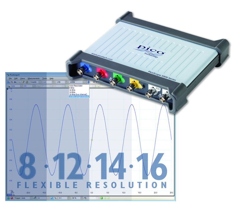 Pour cette architecture, Pico Technology a développé un frontal analogique qui permet de basculer entre ces différentes résolutions. Au-delà, cet oscilloscope qui se branche sur un PC dispose d'une mémoire tampon de 512 méga-échantillons. Le produit est disponible en version 60 MHz à deux voies avec générateur de fonctions intégré et en modèle 200 MHz à quatre voies avec générateur de formes d'onde arbitraires intégré.