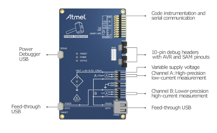 Atmel visualise en temps réel l’impact du code embarqué sur la consommation d’une conceptionLorsque l’on évoque la consommation globale finale d’un produit, on n’évalue pas forcément à sa juste mesure les pics de consommation qui peuvent survenir lors du déroulement du code embarqué. Pics de consommation ...qui sont liés à la manière dont le code est écrit et structuré, même s’il est exempt de bogues. L’outil de débogage proposé par Atmel, baptisé Power Debugger, permet aux concepteurs de se prémunir contre cet inconvénient grâce à une carte ad hoc qui se connecte à la solution en cours de développement et qui permet de visualiser l’évolution en temps réel de la consommation. L’idée étant de localiser, pendant le déroulement de l’application, les lignes de code responsables des pics ou des anomalies de consommation préjudiciables notamment dans les systèmes à très basse consommation de l’Internet des objets. Ce “débogueur de consommation”, outre la fonction classique de débogage du code de bas niveau, intègre deux sondes qui collectent en temps réel l’évolution de la consommation de l’électronique, en courant et tension, pendant l’exécution du code applicatif. Ces données sont ensuite fournies à l’environnement de développement Studio 7 d’Atmel, plus précisément au module Data Visualizer qui affiche à l’écran le graphique d’évolution de la consommation que l’on peut alors corréler très précisément aux lignes de code en cours d’exécution. Une approche qui permet d’identifier les passages délicats du code, et ceux qui génèrent des pics de consommation. L’outil d’Atmel, qui se présente sous la forme d’un module à connecter à la carte en cours de développement et d’un lien USB pour la connexion à la station de travail, est destiné aux microcontrôleurs à base de cœurs ARM Cortex-M de la société ainsi qu’à la série des microcontrôleurs AVR, tous dotés d’interfaces de débogage et d’accès aux données de bas niveau JTAG, SWD, PDI, debugWIRE, aWire, TPI et SPI.