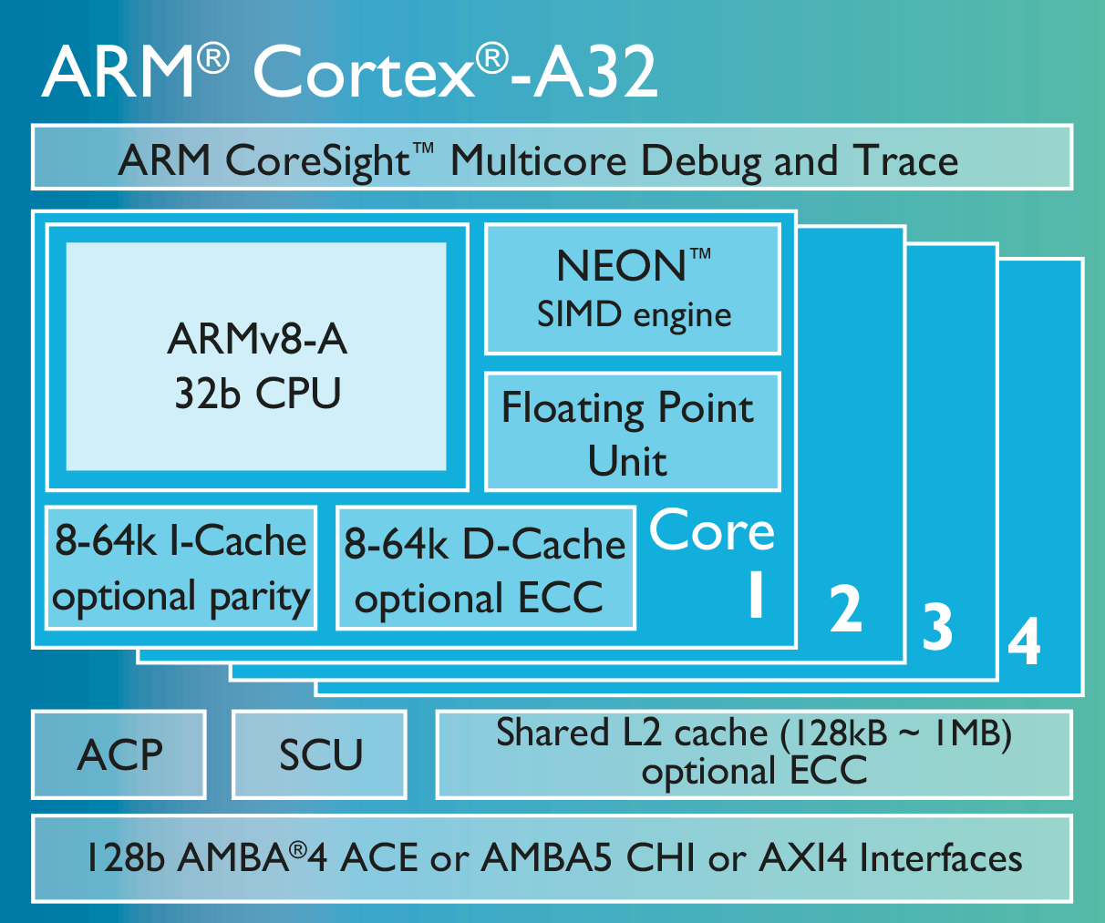 ARM amène l´architecture ARMv8-A des Cortex-A50 dans le monde des objets connectésARM a marqué l´ouverture du salon Embedded World 2016, qui se tient du 23 au 25 février à Nuremberg (Allemagne), en annonçant un nouveau membre dans sa famille de processeurs d´application éco-efficaces, ...le Cortex-A32 en l´occurence. Un coeur censé amener l´architecture ARMv8-A (déjà à l´oeuvre dans les processeurs 64 bits Cortex-A53 et A57) au sein des applications embarquées 32 bits. Le Cortex-A32, qui devient de fait le coeur le plus compact et le plus éco-efficace de la famille ARMv8-A et qui bénéficie de la technologie de sécurisation TrustZone, s´inscrit dans le prolongement des Cortex-A5 et Cortex-A7, basés sur l´architecture ARMv7 et bien implantés sur le marché des processeurs d´application pour systèmes embarqués, assure la firme britannique. En termes de performances, le dernier-né des coeurs ARM 32 bits, qui peut être implémenté dans des versions quadricoeurs, est 25% plus efficace que le Cortex-A7 et offre donc plus de performances pour une consommation moindre. Dans sa configuration la plus compacte, il occupe moins de 0,25 mm2 de silicium tout en consommant moins de 4 mW à une fréquence de 100 MHz une fois gravé en technologie 28 nm, indique ARM qui cible, avec le Cortex-A32, les objets connectés compacts et sobres nécessitant néanmoins un OS riche mais aussi les passerelles IoT et les applications industrielles.