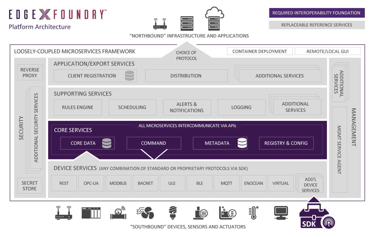 Passerelles IoT et "edge computing" : les premiers kits de développement EdgeX Foundry arrivent[EDITION ABONNES] Le projet open source EdgeX Foundry, qui souhaite encourager l’existence d’un écosystème de composants logiciels interopérables pour passerelles IoT placées en bordure de réseaux industriels et dotées de fonctions d’edge computing, a fait encore un pas supplémentaire vers la réalisation de son objectif. ...A l’occasion du salon IoT Solutions World Congress qui s’est tenu à Barcelone du 16 au 18 octobre, ses contributeurs ont annoncé la disponibilité de kits de développement compatibles EdgeX, des outils jugés importants pour bâtir des applications et des solutions ad hoc. On rappellera que le framework EdgeX a vocation à s’exécuter sur n’importe quel système d’exploitation ou architecture matérielle et à unifier des composants logiciels, quel que soit le langage de programmation utilisé pour les coder. L’idée étant d’assurer la plus grande interopérabilité entre équipements connectés, applications et services pour un large éventail de cas d’usage. EdgeX, qui s’appuie sur des microservices, vise en pratique à faciliter l’interopérabilité entre les standards de connectivité existants et des logiciels professionnels à valeur ajoutée (analyse de données en périphérie de réseau, sécurité, gestion système, services, etc.).
