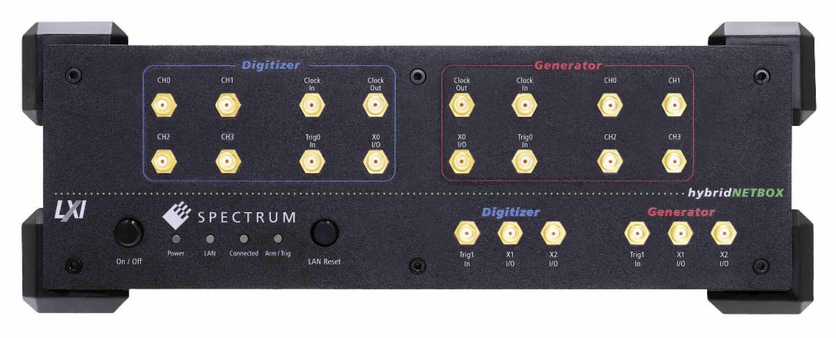 - Générateur et numériseur dans un seul boîtierLa gamme de produits hybridNETBOX de Spectrum Instrumentation, plates-formes d'instrumentation qui combinent générateur de formes d'onde arbitraires et numériseur dans une seule unité portable, s’étend avec l'ajout de huit modèles hautes performances. Cet instrument qui génére et acquiert des signaux simultanément est adapté aux applications impliquant des tests de type “stimulus-réponse” ou des tests en boucle fermée pour des applications de test de radars, de lidars, de bus, de communication Mimo, etc.... - 14 modèles disponible, avec 2+2, 4+4 ou 8+8 canaux avec des vitesses allant de 40 Méch./s à 1,25 Géch./s - Le modèle DN2.825-04 fournit par exemple quatre canaux de génération de formes d’onde arbitraires à des débits jusqu'à 625 Méch./s pour une résolution de 16 bits et quatre canaux de numérisation à 500 Méch./s sur 14 bits - Canaux programmables pour émettre des signaux avec des amplitudes jusqu'à ± 3 V sous une charge de 50 ohms ou ± 6 V en haute impédance (1 Mohm) - Les modèles fonctionnant à 1,25 Géch./s émettent des signaux à ± 2,5 V sous 50 ohms et ± 5 V pour 1 Mohm - Système d'horloge flexible qui permet de sélectionner les paramètres de sortie ou de fréquence d'échantillonnage