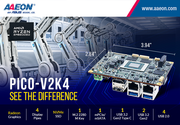 - Ordinateur monocarte au format Pico-ITX doté d'un AMD Ryzen V2000Aaeon propose avec la référence PICO-V2K4 un petit ordinateur monocarte embarqué architecturé autour du processeur Ryzen V2000 d’AMD comprenant jusqu'à 8 cœurs. La carte héberge également des cœurs de traitement graphique Radeon d’AMD, avec jusqu'à 7 unités de calcul, le tout aux dimensions de 100 x 72 mm. Les domaines visés sont ceux des applications industrielles automatisées et des équipements médicaux (analyse par rayons X et IRM). - Enveloppe thermique de 10 W à 25 W - Jusqu’à 64 Go de stockage intégré NVMe et emplacement d'extension M.2 2280 M-Key - Capacité de gérer des graphiques sur 4 écrans de résolution 4K en simultané - Un port USB 3.2 Gen2 Type-C et un USB 3.2 Gen2 x 2 (en face arrière) et quatre interfaces USB 2.0 (sur la carte) - Température de fonctionnement de 0 à 60°C