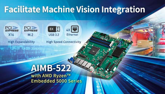 - Carte mère industrielle Micro-ATX dotée d’un Ryzen Embedded 5000 d’AMDAdvantech présente l'AIMB-522, une carte mère industrielle au format Micro-ATX adaptée au traitement d'images avec de l’intelligence artificielle pour les secteurs de l'automatisation et de la vidéosurveillance. L'AIMB-522 est architecturé autour du processeur bureautique d’AMD, le Ryzen Embedded 5000, gravé en 7 nm, qui dispose de 16 cœurs Zen 3 à haute performance et un cache mémoire L3 adaptés aux applications sensibles à la latence. - Carte au format carré de 24,4 x 24,4 cm - Une interface PCIe Gen 4, 4 ports Gigabit Ethernet et 8 ports USB 3.2 - Connectivité complète pour des caméras haut débit avec des débits de transfert allant jusqu'à 350 Mo/s et/ou 60 images/s - Capacité à intégrer plus de 10 caméras vidéo de haute qualité, sans cartes périphériques supplémentaires - Un emplacement M.2 M-Key intégré pour la prise en charge de solutions de stockage SSD haut débit