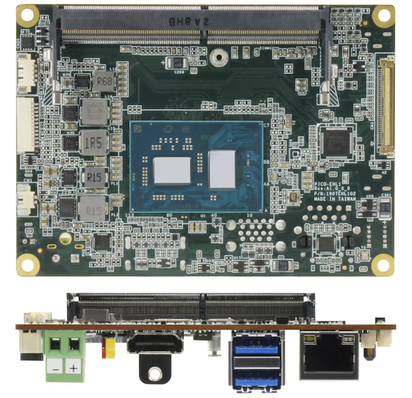 - Carte Pico-ITX fondée sur un processeur Atom ou Celeron “Elkhart Lake” d’IntelConçue pour les applications d'affichage numérique, les casiers intelligents et les guichets automatiques, la carte PICO-EHL1 au format Pico-ITX développée par Aaeon est architecturée autour d’un processeur Intel “Elkhart Lake”, soit un Atom ou un Celeron. Cette carte est une alternative au modèle PICO-EHL4 de la société lancé en 2020, mais avec un ensemble de fonctionnalités différent. Dans le détail, cet ordinateur monocarte est proposé avec un Atom x6425E, un Atom x6211E, un Celeron J6412 ou un Celeron N6210 dual-core et quad-core avec jusqu'à 32 Go de mémoire DDR4. - Prise en charge du stockage SATA et mSATA - Jusqu'à trois interfaces d'affichage - Interface Gigabit Ethernet et deux ports USB 3.2 - Dimensions de 100 x 72 mm - Jusqu’à 32 Go de mémoire DDR4 à 3 200 MHz