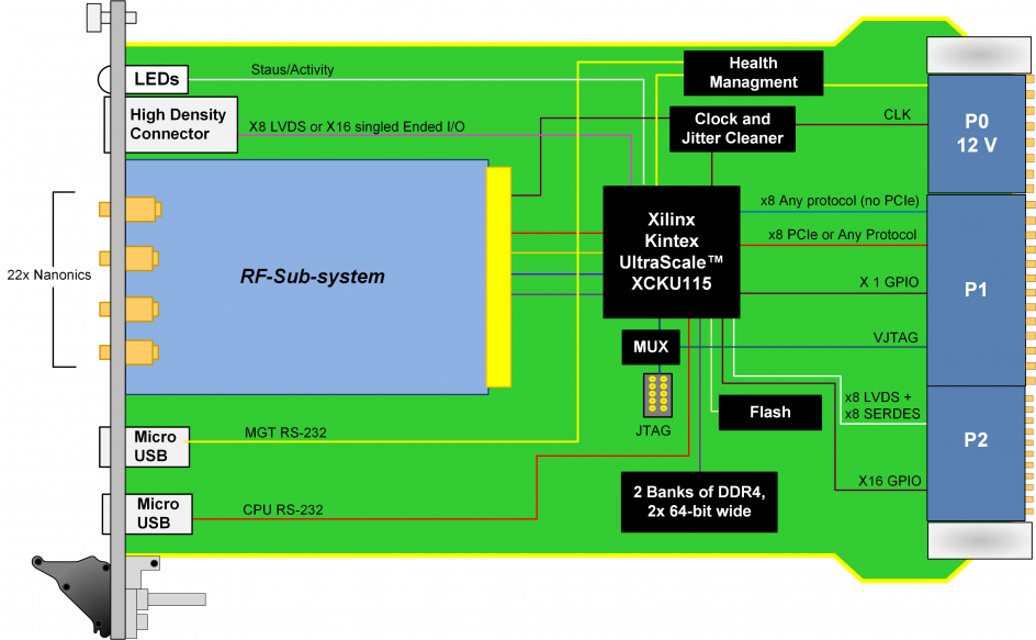 - 16 liens SerDes haute vitesse sur le connecteur P1 (configurables en PCIe, SRIO, 10GbE, Aurora, etc.)