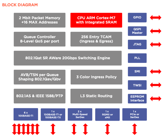 Les circuits de commutation automobiles à très faible latence et à grand nombre de ports référencés 88Q5072 et 88Q6113 de Marvell sont dotés de capacités de routage de plusieurs gigabits par seconde et sont fondés sur des coeurs Arm Cortex-M7. ...Ils ciblent les solutions automobiles à large bande passante qui doivent agréger des données à très haut débit avec un routage avancé et des capacités de sécurité élevées (via un moteur d’inspection approfondie des paquets). Un accélérateur matériel intégré permet un débit de routage jusqu'à 10 Gbit/s sans intervention du processeur interne.