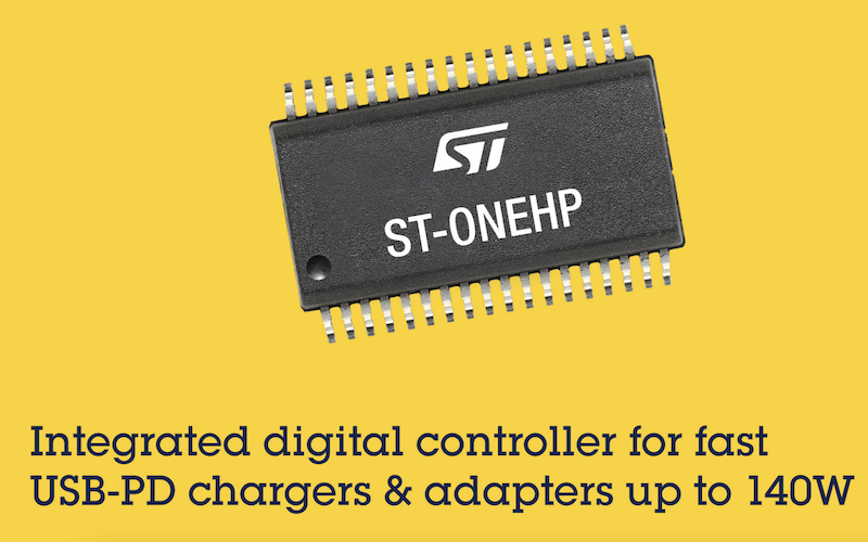 Le contrôleur numérique ST-ONEHP de STMicroelectronics, certifié par l’organisme USB-IF conformément à la spécification USB Power Delivery Extended Power Range, simplifie la mise au point de chargeurs et d'adaptateurs d'alimentation USB jusqu'à 140 W. Le circuit est architecturé autour d’un microcontrôleur Arm Cortex-M0+ et possède un redresseur synchrone intégré. En combinant le ST-ONEHP avec le circuit SiP MasterGaN1 de 9 x 9 mm de ST, une conception de référence (EVLONE140W), plus petite qu'un chargeur d'ordinateur portable de 65 W, a été mise au point dans un volume de 90 cm3.