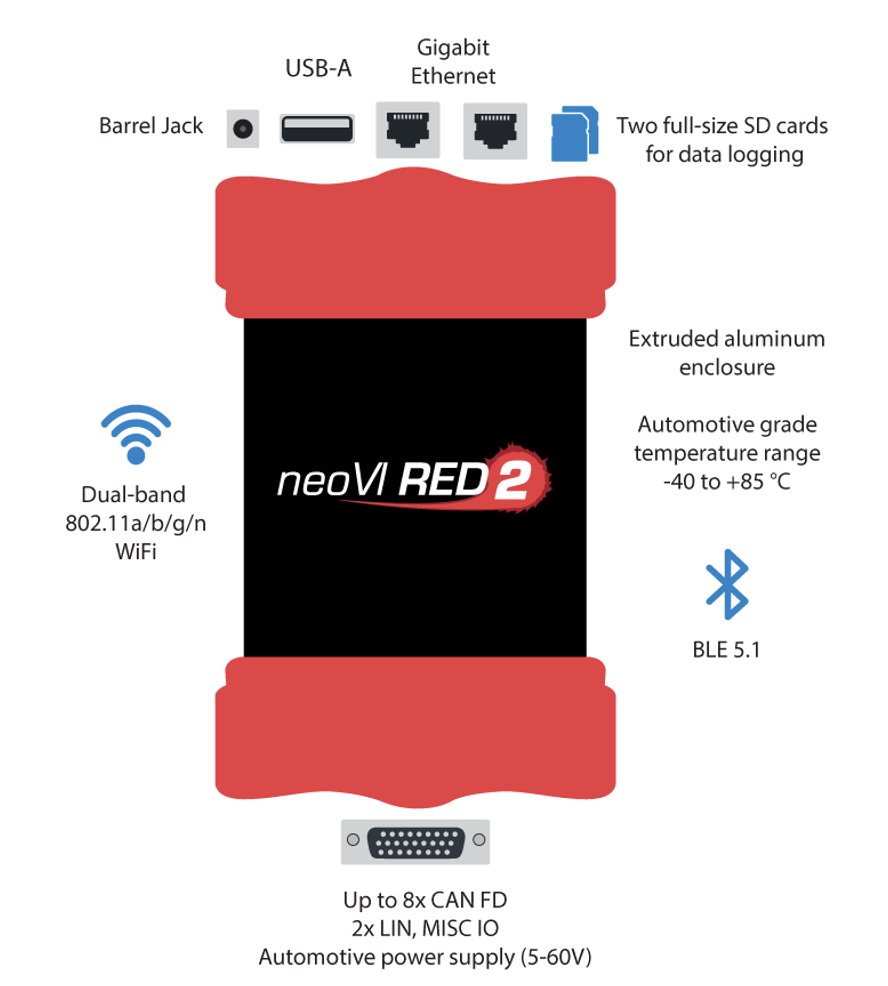 Intrepid Control Systems (représenté en France par NeoMore) propose avec le NeoVI RED 2 un instrument de petite taille (14 x 11 x 4cm) destiné au test des réseaux automobiles, notamment le CAN FD. Cet instrument est d’abord une interface pour PC communiquant simultanément avec 8 canaux CAN FD compatibles CAN, 2 canaux LIN et 1 canal Ethernet 1000Base-T avec protocoel DoIP/XCP. Un GPS intégré, un accéléromètre-magnétomètre et 4 entrées/sorties numériques/analogiques ou PWM sont aussi disponibles. Son alimentation accepte une plage de tension de 5 V à 60 V, et il fonctionne dans une plage de température de -40°C à +85°C.