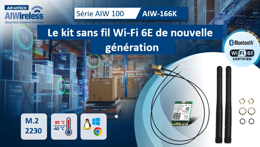 L'AIW-166K 6E d'Advantech est un kit complet de connexion sans fil au standard Wi-Fi 6E conçu pour les solutions industrielles qui nécessitent un débit plus rapide, des taux de transmission élevés et une plus grande autonomie qu'avec le Wi-Fi classique. Le kit prend en charge le Wi-Fi double flux dans les bandes 2,4 GHz, 5 GHz et 6 GHz. Il comprend un module Wi-Fi 6E, des antennes et des câbles pour les tests de produits en développement, afin de réduire l'effort global de développement et accélérer la mise sur le marché des applications pour équipements médicaux, dispositifs de transport et bornes de vente au détail.