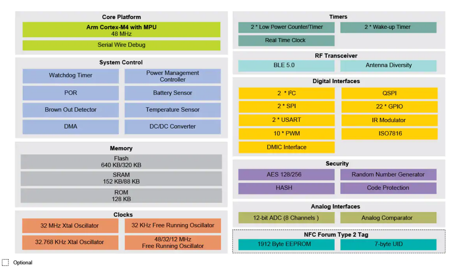 - Arm Cortex-M4 cadencé à 48 MHz avec jusqu'à 640 Ko de mémoire flash et 152 Ko de SRam