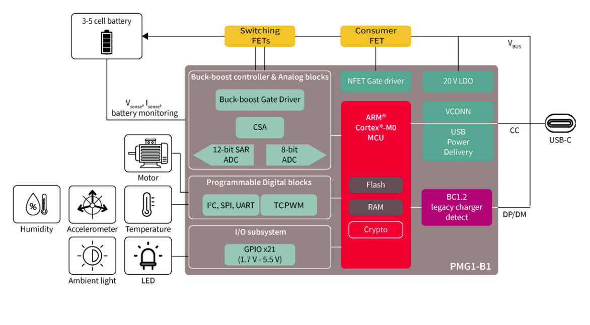 L'USB-C devrait remplacer la majorité des adaptateurs d'alimentation conventionnels jusqu'à 240 W. Pour répondre aux exigences de cette tendance, Infineon propose le circuit EZ-PD PMG1-B1 qui complète la famille des EZ-PD PMG1, microcontrôleurs haute tension avec alimentation USB-C PD (pour Power Delivery). Cette solution à puce unique intègre un contrôleur USB-C PD, un contrôleur de charge de batterie buck-boost, des circuits de protection haute tension et un microcontrôleur. Elle cible les applications alimentées par batterie, notamment les outils électriques, les appareils électroménagers intelligents et autres appareils portables.