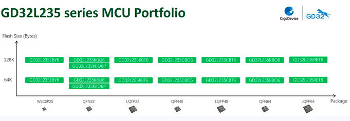 GigaDevice propose plusieurs microcontrôleurs à basse consommation de la famille GD32L235. Cette famille est conçue pour répondre aux besoins du segment de marché des applications à forte contraintes en matière de consommation d’énergie : compteurs industriels, serrures de porte intelligentes, appareils portables IoT, cigarettes électroniques,etc. La série offre 16 options de modèles répartis en sept boîtiers (LQFP64/48/32, QFN64/48/32 et WLCSP25). Ces microcontrôleurs sont équipés d’un convertisseur A/N sur 12 bits prenant en charge les modes d'entrée différentielle et asymétrique, ainsi qu’un convertisseur N/A sur 12 bits.