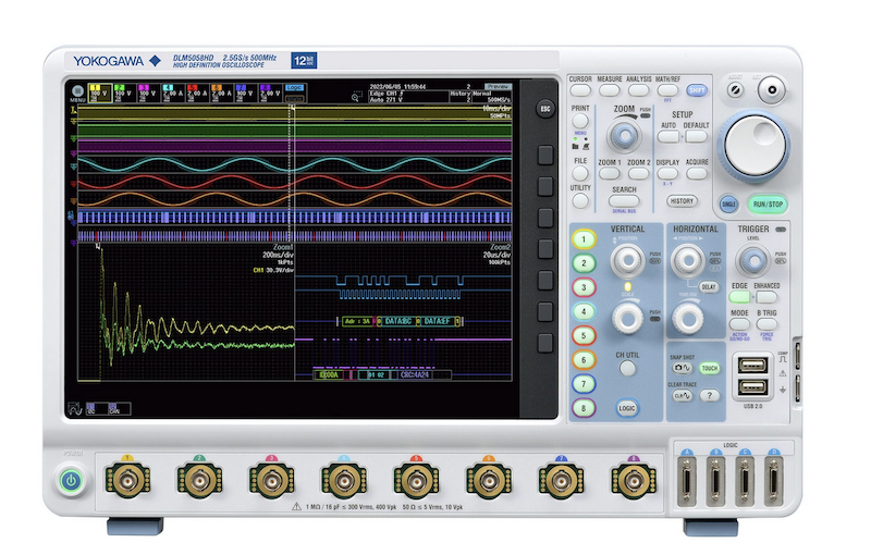 La série des instruments DLM5058HD de Yokogawa comprend des oscilloscopes dotés d’une bande passante analogique d’entrée de 350 ou 500 MHz sur 8 voies. Ces appareils augmentent les performances accessibles aux utilisateurs par rapport à la génération précédente, les DLM5000. La série se compose de deux modèles huit voies (500 MHz DLM5058HD et 350 MHz DLM5058HD) et de deux modèles quatre voies (500 MHz DLM5054HD et 350 MHz DLM5034HD). Avec un seul appareil il est possible par exemple de mesurer le comportement de systèmes de freinage, ou d'analyser d’autres systèmes qui nécessitent d’être enregistrés à des vitesses d'échantillonnage élevées pendant plusieurs millisecondes.