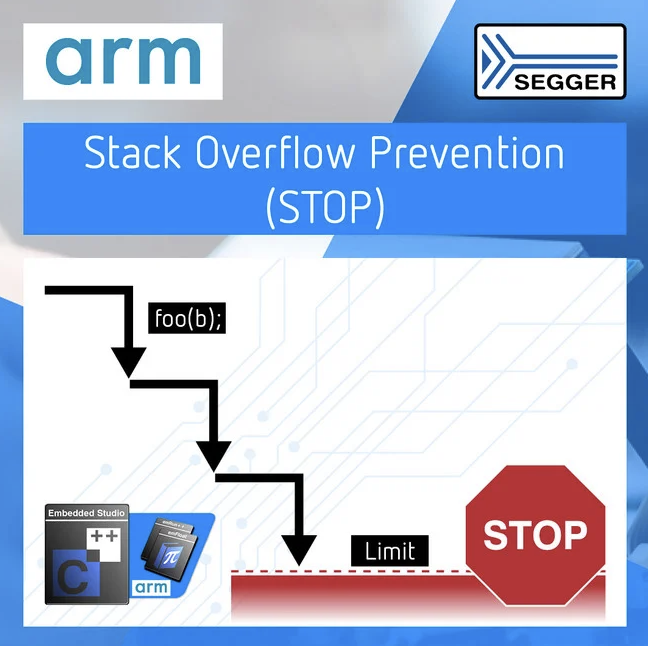 Segger ajoute la technologie STOP (Stack Overflow Prevention) à son environnement de développement Embedded Studio for ARM afin de prévenir de manière fiable les débordements de pile. Avec STOP activé, le compilateur ajoute un appel à une routine de contrôle de limite de pile chaque fois que nécessaire, avant d'ajuster le pointeur de pile. L'option STOP pour le compilateur est activée sans aucune modification du code d'application. De cette façon, tous les débordements de pile non détectés sont évités, empêchant toutes sortes de défaillances dans un système embarqué, allant des erreurs de calcul difficiles à détecter et apparemment aléatoires à des dysfonctionnements graves ou même à des plantages.