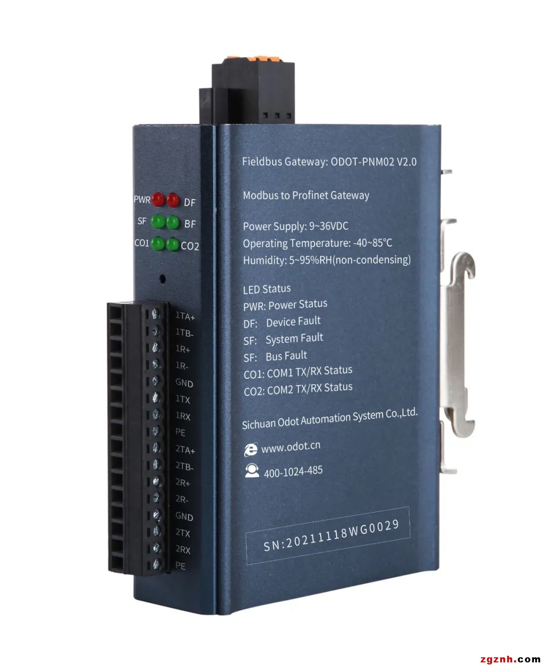 Les passerelles ODOT-PNM02 V2.0 et V2.1 conçues par la firme chinoise Odot (distribuées en France par ADM21) sont des convertisseurs de protocole Modbus-RTU/Ascii vers un réseau Profinet I/O Device. Tout appareil doté d'une interface RS485/RS232/RS422 gérant le protocole Modbus-RTU/Ascii ou un autre protocole série non standard peut être connecté à cette passerelle afin d’établir une communication à travers le bus industriel Profinet sur lequel se connectent automates industriels, systèmes numériques de contrôle-commande, E/S déportées, dispositifs de protection de départ moteur, appareils de mesure, etc.