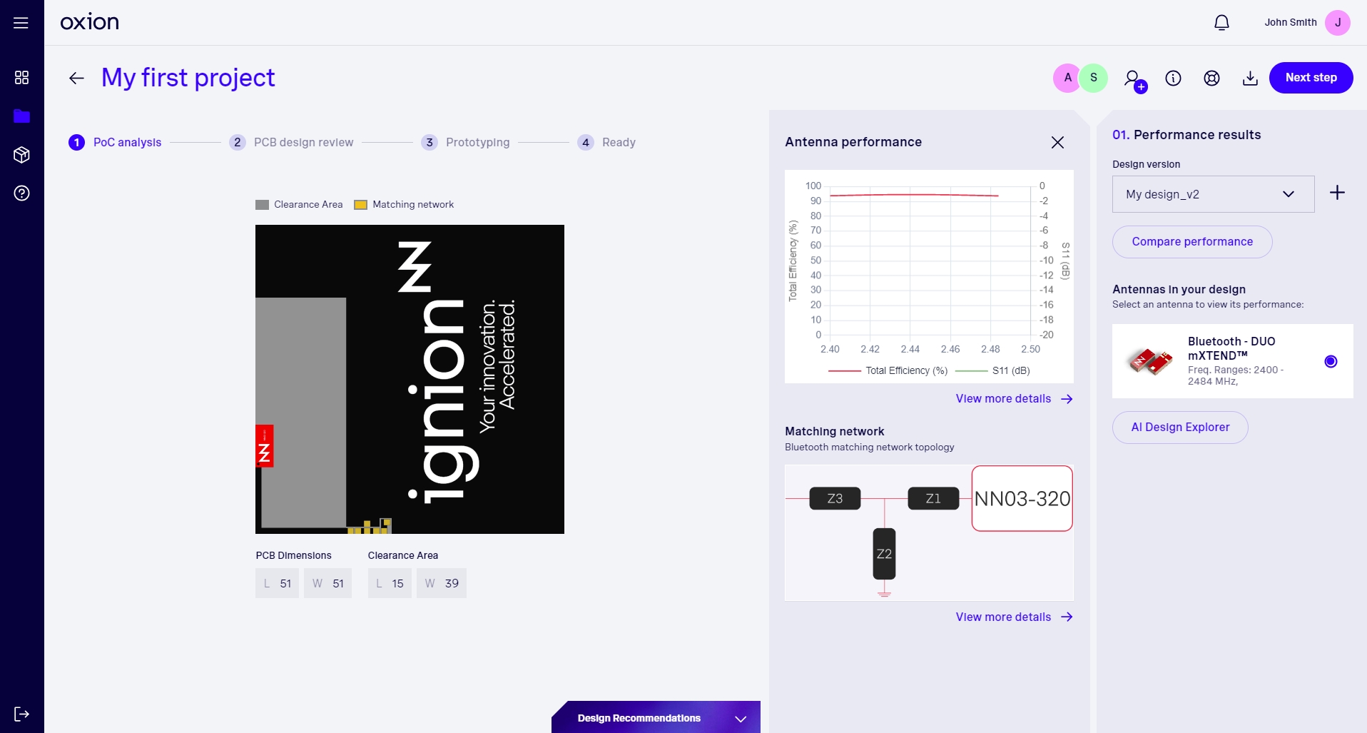 La solution Oxion d’Ignion (distribuée par Mouser) veut simplifier l'intégration des antennes dans un système connecté. Elle s’adresse aux fabricants en proposant une plateforme de développement gratuite visant à réduire le temps de conception des appareils sans fil. Grâce à un accès à l’outil dans le cloud (AWS, Amazon Web Services), les développeurs peuvent exploiter la puissance des algorithmes d’intelligence artificielle et d’apprentissage automatique en temps réel. Et grâce à un retour immédiat sur les performances système, ils peuvent peaufiner la conception, décider du composant d’antenne à utiliser et de son emplacement sur le PCB.