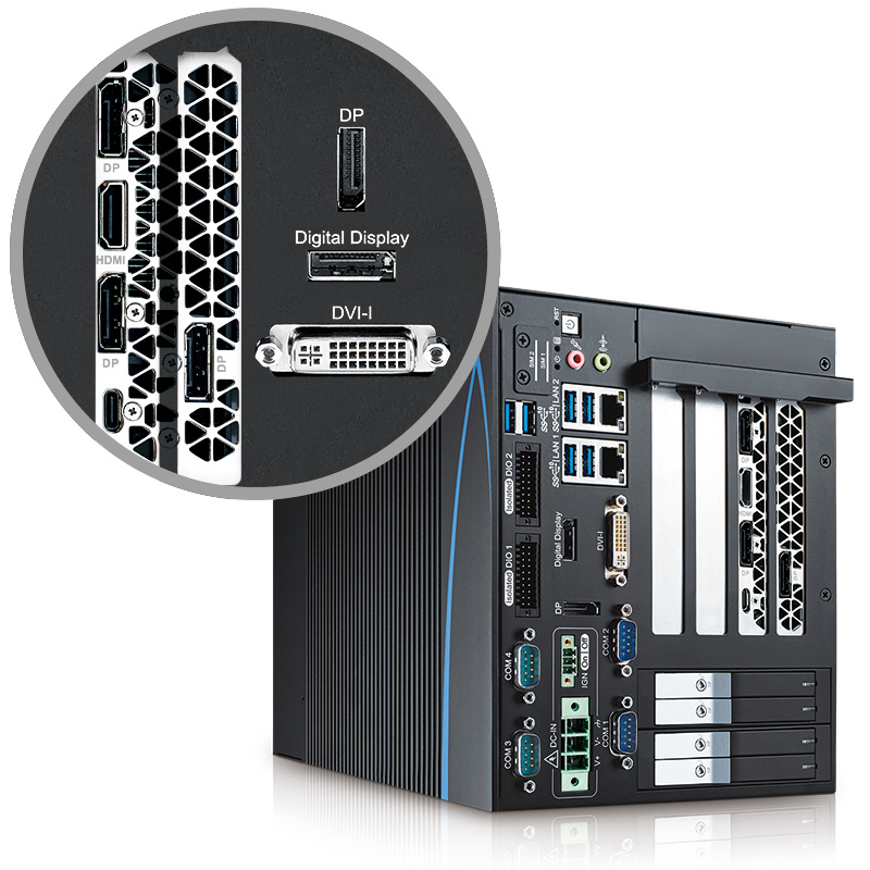 - Gestion jusqu’à 7 écrans HD indépendants, dont 1 DVI, 1 HDMI et 5 DisplayPort, avec une résolution maximale de 8K