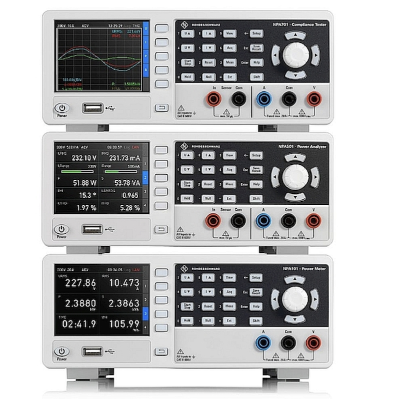 Rohde & Schwarz propose une famille d’analyseurs de puissance qui s’appuie sur trois instruments qui répondent à des besoins différents pour réaliser jusqu’à 23 mesures standard de tension, de courant, de puissance et de distorsion harmonique sur des sources d’alimentation continue et alternative. L’instrument référencé NPA101 effectue toutes les mesures fondamentales, l’analyseur de puissance NPA501 propose des fonctions de mesure complémentaires et des capacités d’analyse graphique, alors que le modèle NPA701 intègre en outre des fonctions de test en conformité aux normes CEI 62301 et EN 50564 (consommation d’énergie) et à la norme EN 61000-3-2 (émission d’harmoniques). Cette palette d’instruments remplace les analyseurs de puissance de la gamme HMC8015 de Rohde & Schwarz.